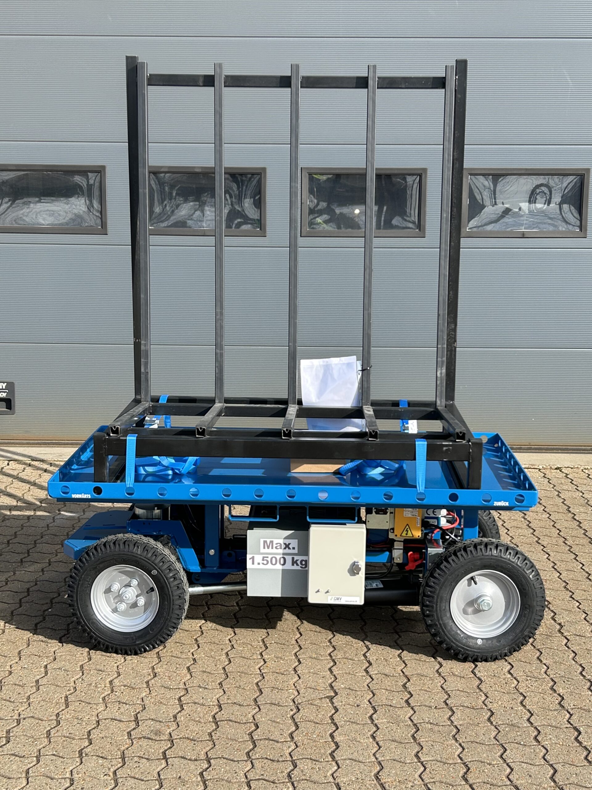 Der Transportwagen ErgoMover Go Cargo verfügt über eine Plattform von 1510 × 820 mm, die rundum mit Verzurrösen ausgestattet ist.