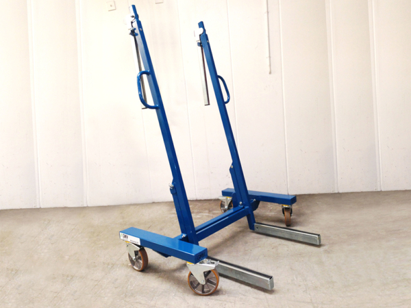 ErgoLoader ist ein effizientes, mobiles Plattenregal mit Rädern, das eine ganze Palette Gipskartonplatten (42 Stück) in aufrechter Position direkt vom ErgoMover-Manipulator aufnehmen kann.