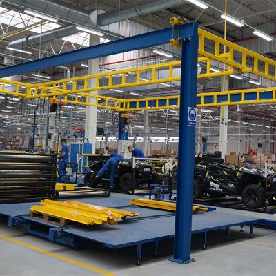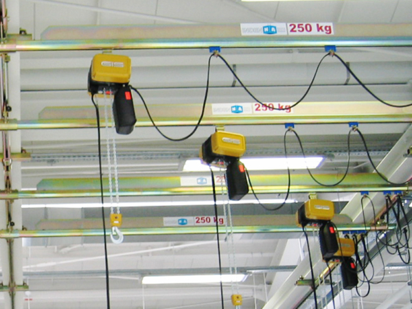 As an alternative to aluminum overhead rail systems, we offer Helm Hellas steel rail systems. The systems are available in the inexpensive galvanized version or where conditions require it in stainless steel. The system is modular, and a wide range of accessories is available.