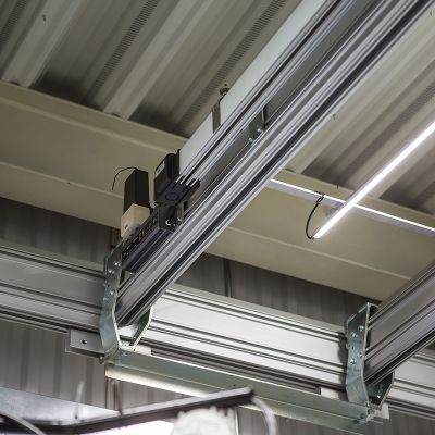 Vores mest solgte traverskran er det letløbende aluminiumsskinnesystem Mechrail fra Movomech, som er af høj svensk kvalitet.